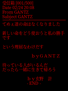 :GANTZです はまりすぎて・・・ クラスのみなさんうるさくてすみません 2個ありますけど つまらないですが 計くんはカッコいいです